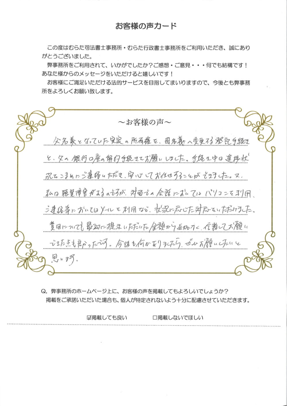 2026.01.06 ブログ お客様の声 お客様の声24(相続登記、遺産承継業務) 父名義となっていた実家の所有権を、母名義へ変更する登記手続き と、父の銀行口座の解約手続きをお願いしました。手続き中は進捗状 況をこまめにご連絡いただき、安心してお任せすることができました。又、 私は聴覚障害があるのですが、対面での会話においてはパソコンを利用、 ご連絡等においてはメールを利用など、状況に応じた対応をいただけました。 費用についても最初に提示いただいた金額から追加なく、信頼してお願い できた点も良かったです。今後も何かありましたら、ぜひお願いしたいと 思います。 SHAREシェアする